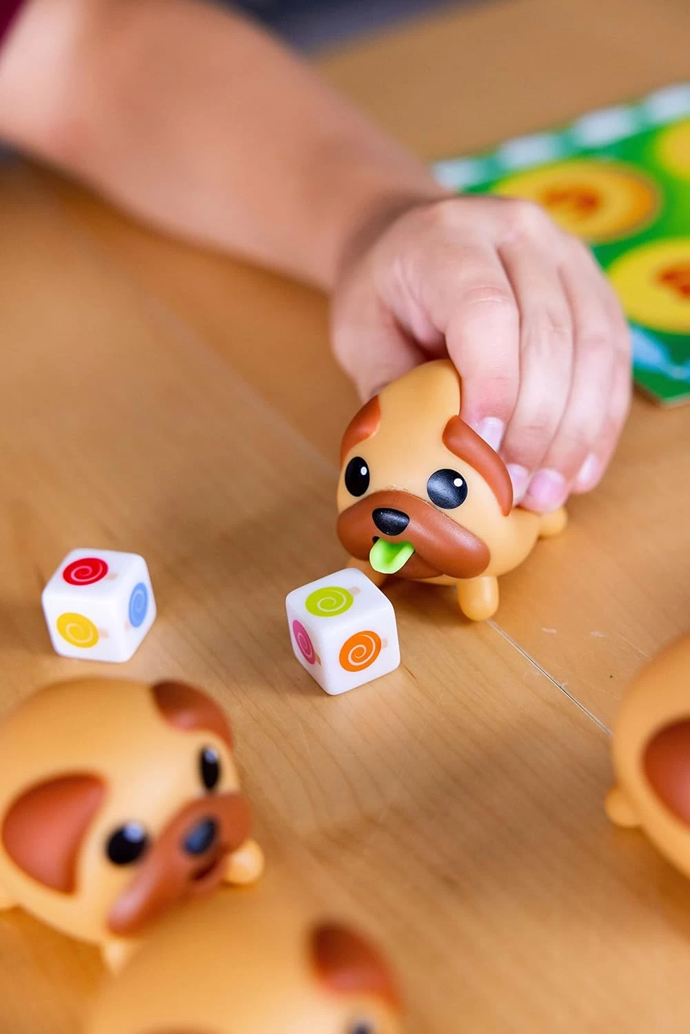 - HOW TO PLAY: Roll two colored “lollipop” dice and squeeze dogs to search for colored tongues that match the dice. Collect six pugs on your dog park to win!
