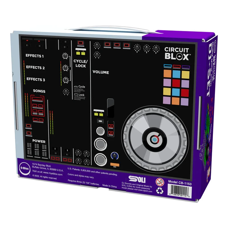 Coming this Fall 2022, E-Blox will be introducing the Circuit Blox BYO DJ Set product that will have your party dancing to some of the coolest DJ songs and sounds around. You build it, and the box turns into a DJ table where you can play 3 original DJ songs recorded by SOLI (USA) (www.djsoli.com) and insert 15 different DJ sounds to get your party hoppin’! You can also connect your music device through BluetoothTM to play your own music out the HI-DEF speaker and insert DJ sounds to your own music.
