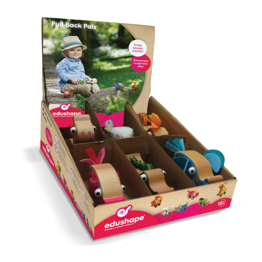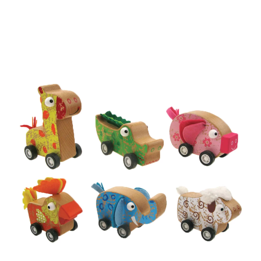 Animal-shaped pull backs. Quality wood & non-toxic dyes.