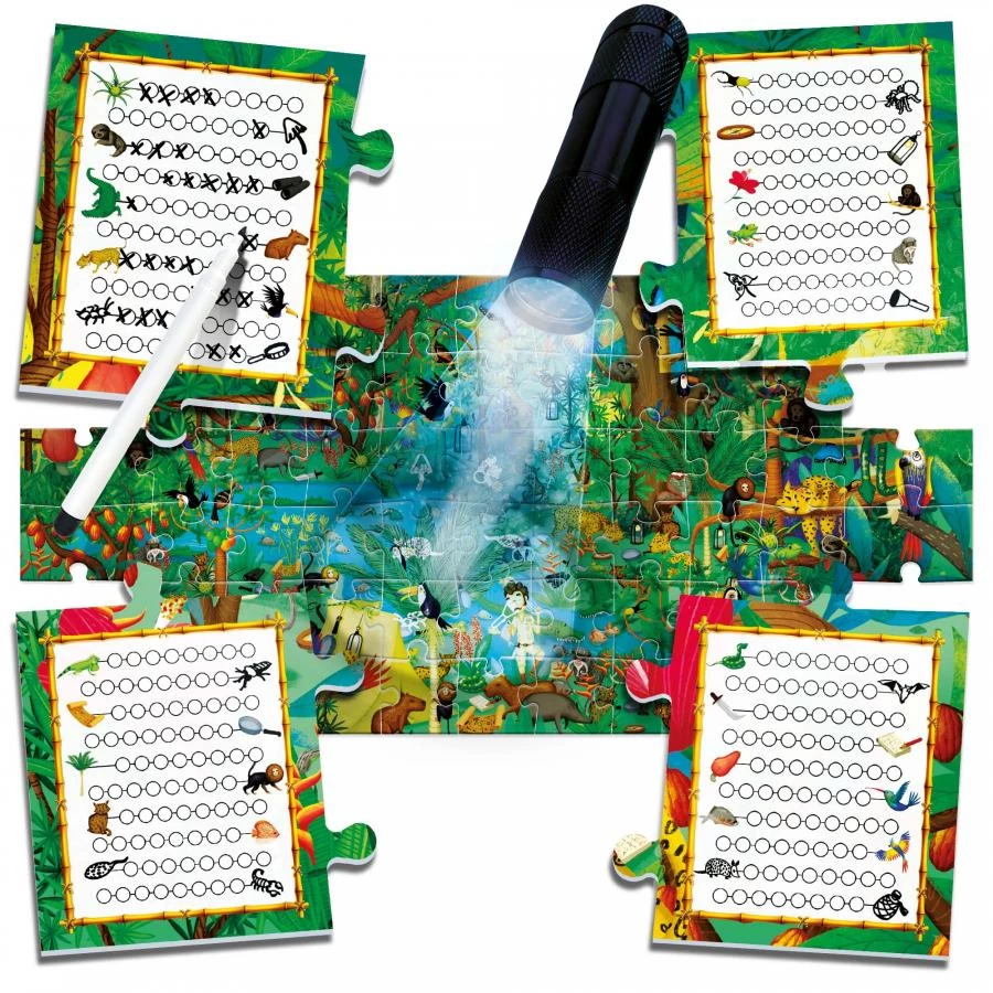 Assemble the puzzle, then carefully observe the illustration and discover the subjects in the forest. Like a real scientist note the individual discoveries on your wipe off cards. In addition, by using the “magic light torch” you can also observe what cannot be seen by the naked eye.