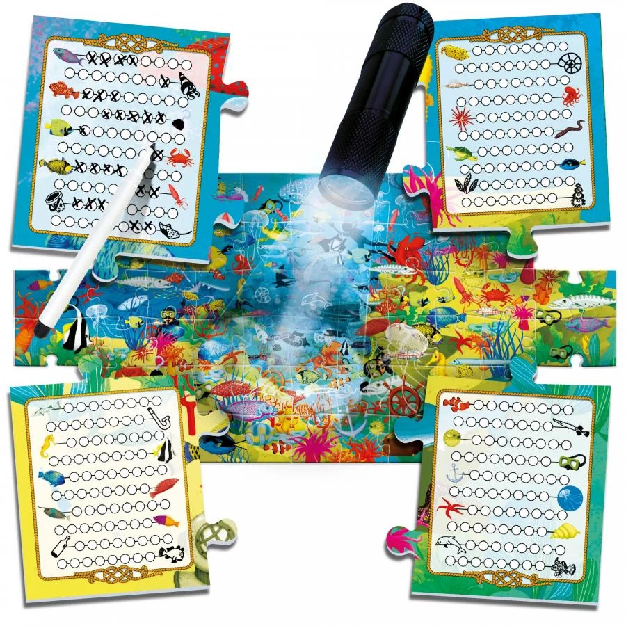 After assembling the puzzle, carefully observe the illustration and discover all the subjects in the sea. Then note the individual discoveries on your wipe off cards, just like a real scientist would do. Thanks to the “magic light torch” included, you can also observe what is invisible to the naked eye.