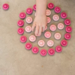 This versatile toy is sure to clear away rainy moods and inspire imagination with the countless ways it can be arranged and stacked! Great for any age, this toy can adapt to fit each child’s play-time needs as they grow older– babies and toddlers can practice hand-eye coordination while fitting the pieces together, and children can learn creative problem solving by turning each bowed piece in ways that form a finely-balanced tower, spread pieces out to be used as tunnels and bridges for toy cars or magical caves for small animals, or turn pieces on their side to make a cheerful fence or a maze!