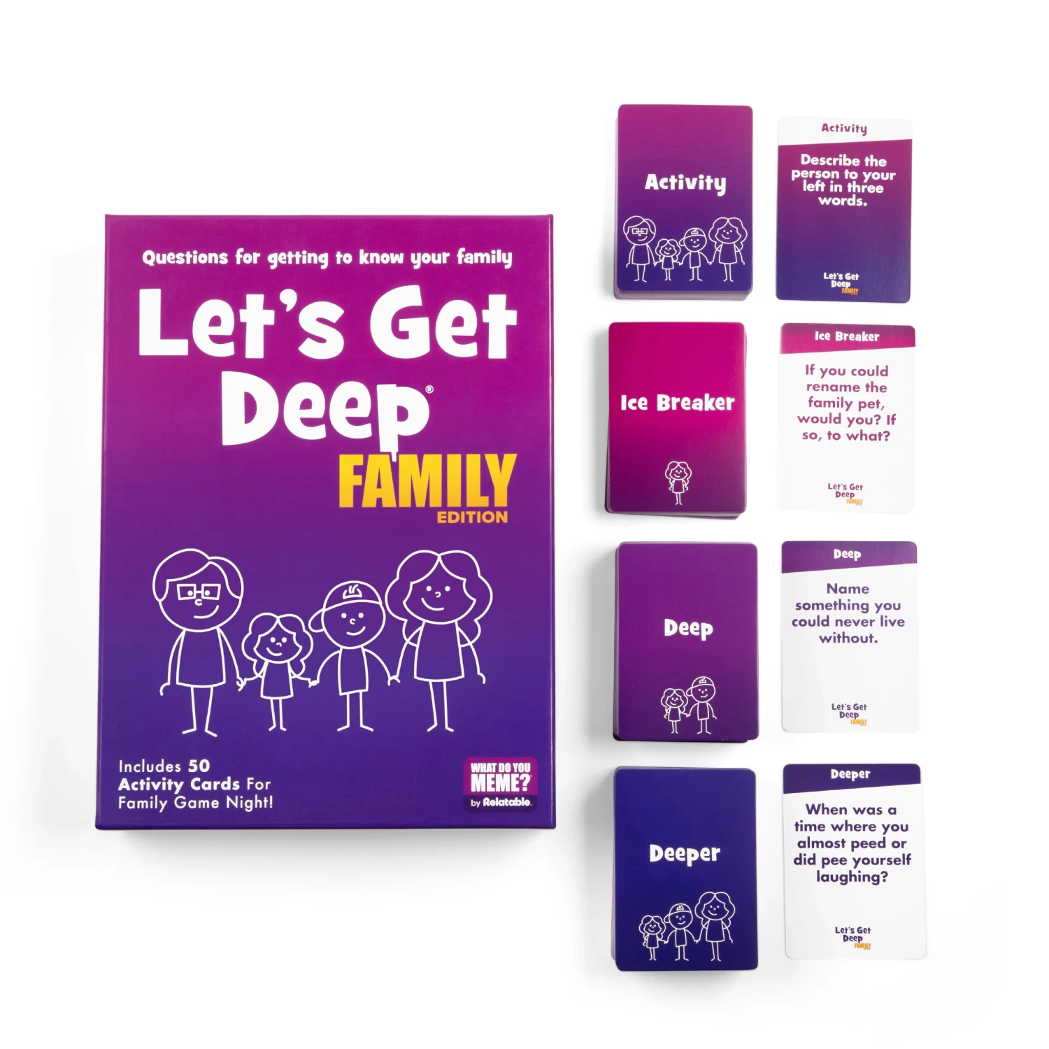Our best selling get-to-know-you game — now for families! Let’s Get Deep® Family Edition is the family card game that’ll turn your dinner table to a conversation station! Packed with fun conversation cards that parents, kids, and friends alike will love, Let’s Get Deep® Family Edition helps create quality time with the ones you love most.