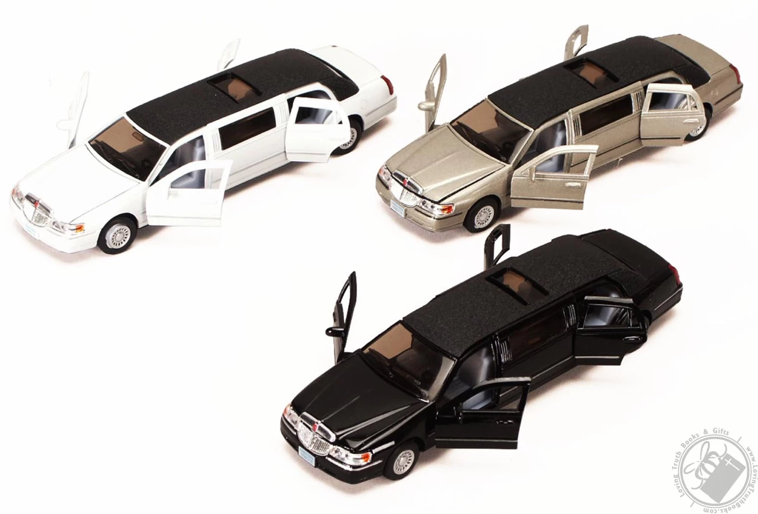 This realistically designed 7-inch town car stretch limousine is unique and eye-catching to customers. These limos are made of die cast metal, features doors that can open, and have a pullback action to it. Offered in three different colors.
