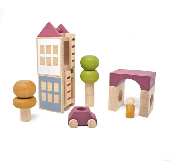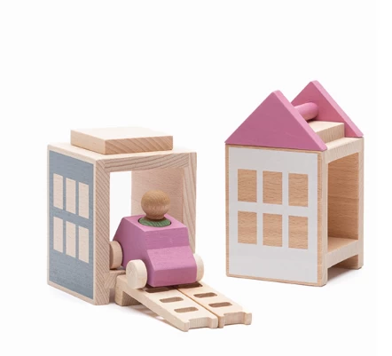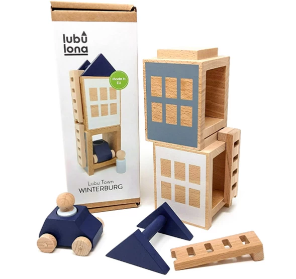 The Lubu Town Pack is a great, educational, modern and creative construction toy set for boys and girls. It comes with 2 stackable houses with 2 ladders, 1 toy car with wooden 1 figure and 1 roof. This unique toy with a subtle design in blue and grey allows children to create different buildings and enjoy a fun time with their own constructions, the wooden toy cars and the little people.