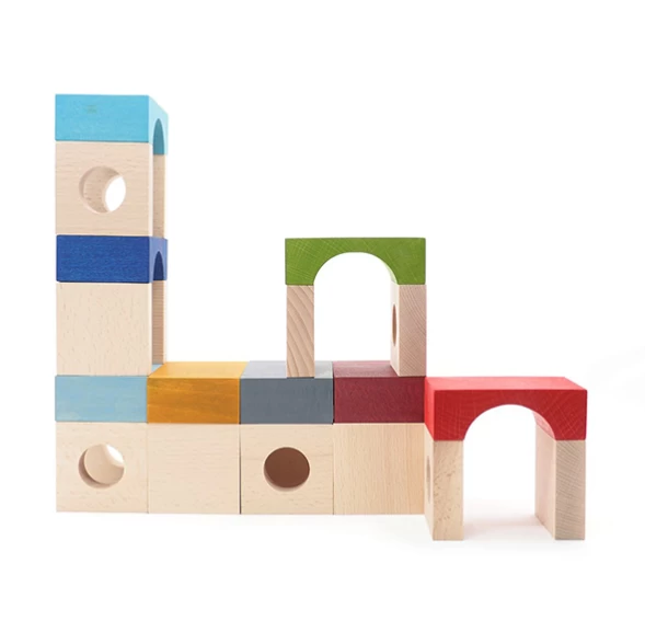 The Tibidabo Large Pack includes unpainted natural wall pieces as well as tunnel-shaped blocks in dark blue, grey, plum, light grey-blue, red, lime green, blue and ochre.