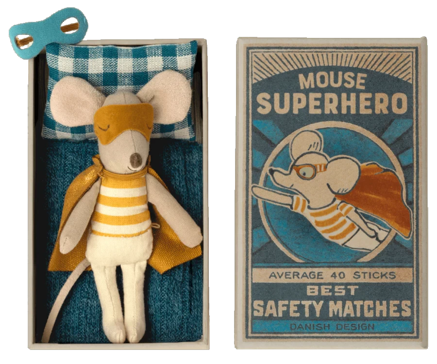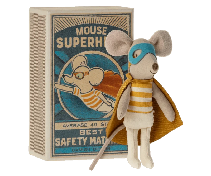 He has an off-white and yellow striped shirt along with his tights, so he can move swiftly through the air. He has a shimmery gold faux suede cape which makes him look extra heroic while flying. He wears a bright blue mask while awake and active, and he even comes with a dark yellow sleeping mask, so can rest peacefully after an exciting day of watching over his Maileg friends. Our Little Brother Superhero arrives in a brilliant and colorful matchbox.