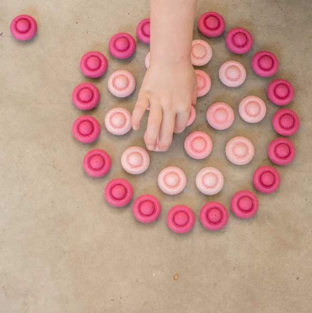 These rosy little petals can be used in endless ways! Perfect as pretend snacks or seeds, for counting and sorting games, or in conjunction with other pieces from Grapat’s beautiful assortment of Mandala-making shapes for a calming and intricate creative experience.