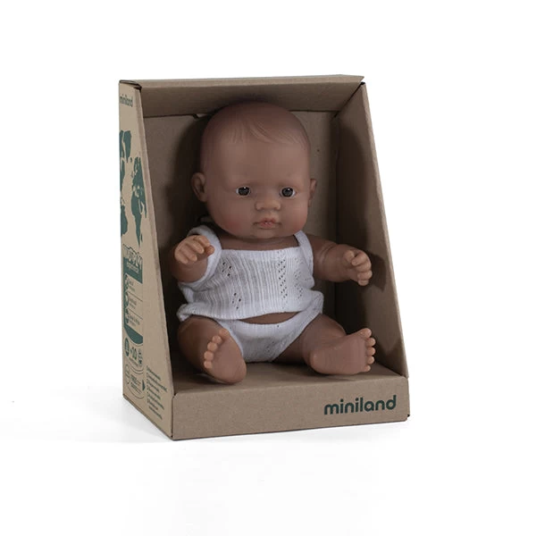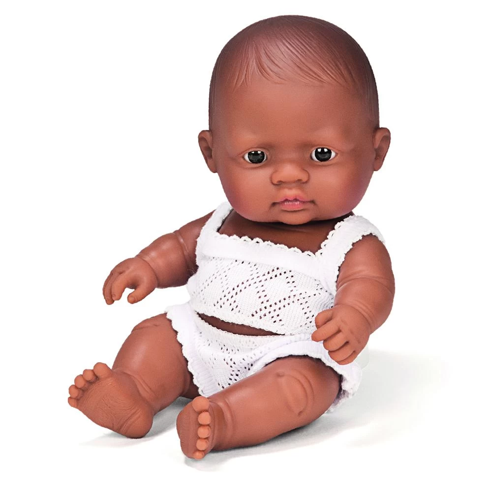 Dolls dressed in underwear and presented in a case. Made of soft vinyl, extremely resistant and flexible. Articulated head, arms and legs. Perfumed body. Very well define facial features that helps children to differentiate between races. They help children to understand concepts such as family, diversity, coexistence.