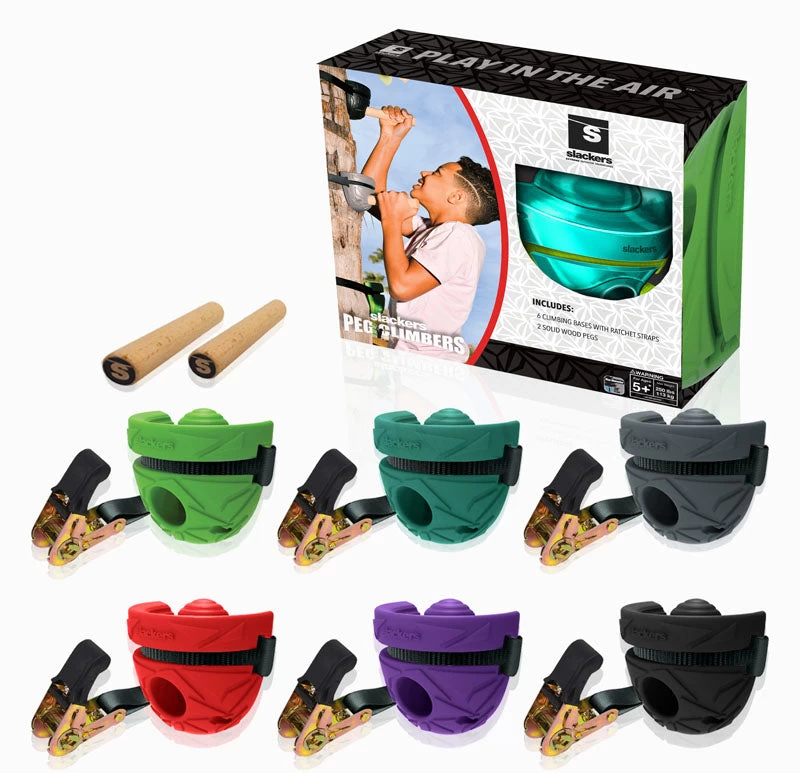 Train ninja style with this tree climbing kit. Includes 6 peg bases with ratchet straps (up to 84″ circumference tree) and 2 solid wood pegs. Peg bases double as climbing holds. Special design will not hurt trees. Max weight: 250 lbs.