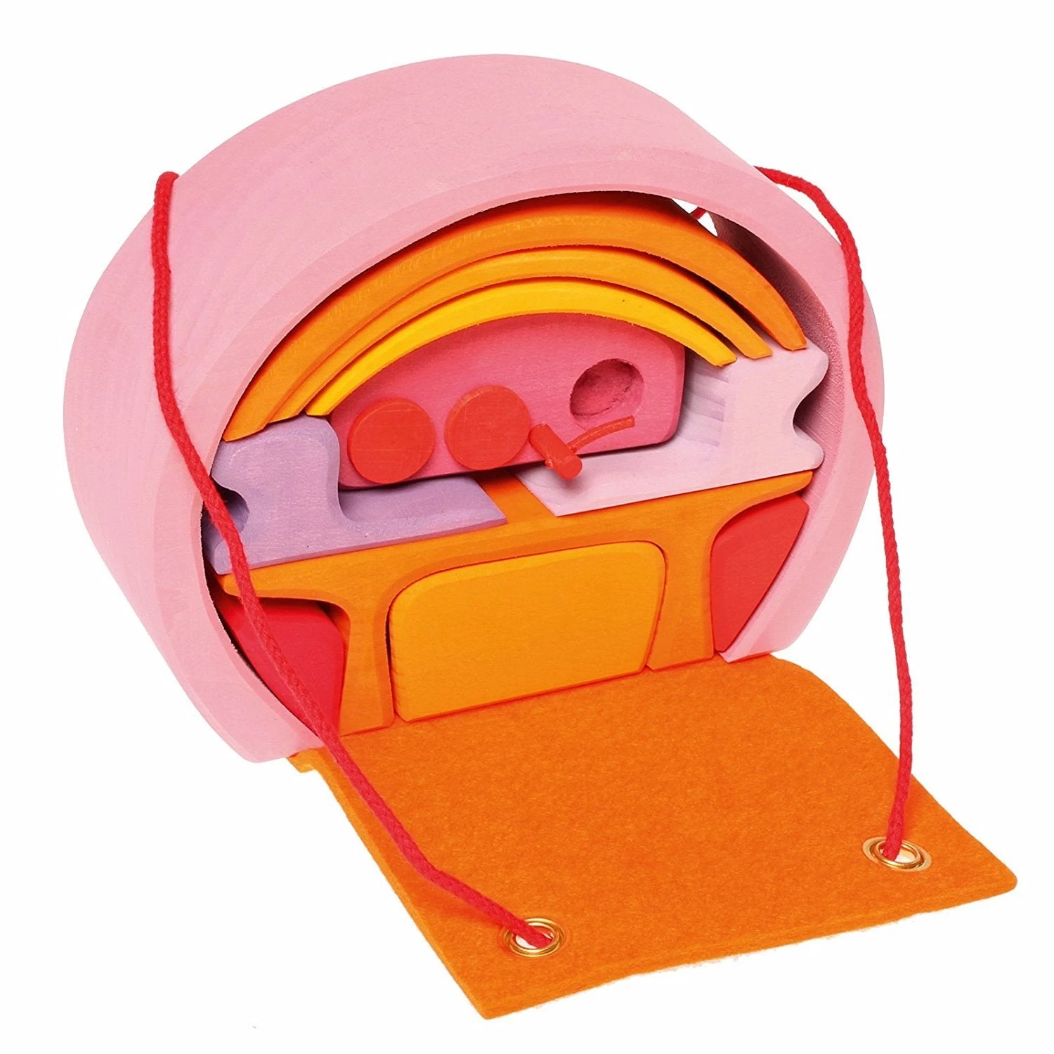Children can develop motor skills, learn about color, and develop creative play with this lovely set.This little mobile wooden dollhouse is dyed with child-safe, water-based colors.