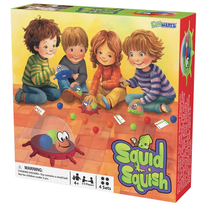 Discover “Squid Squish”, a fun, educational game for kids aged 4-8. This color-matching adventure features 30 vibrant game cards across three difficulty levels, each showing a unique combination of colored balls. The game’s star, the Squid Squish, is a clear plastic dome that ‘captures’ these colored balls when pressed down. The objective? Be the first to collect the right combination of balls as per your game card. Easy to reset and endlessly entertaining, Squid Squish turns learning colors and counting into a squishy, squashy blast!